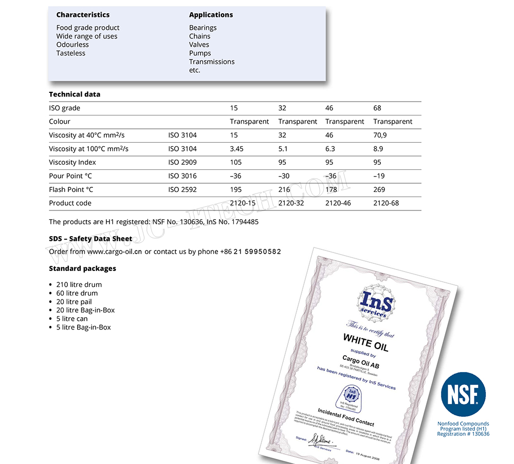 White Oil is a transparent, food grade lubricating oil based on highly refined paraffinic oils. The oil is developed for food processing industries and applications where the demands for purity/cleanness and hygiene are high. White Oil has a broad range of uses and is taste- and odourless. A few examples of different applications: bearings, hydraulic systems, transmissions (which do not require an EP-lubricant), compressors, pumps etc.