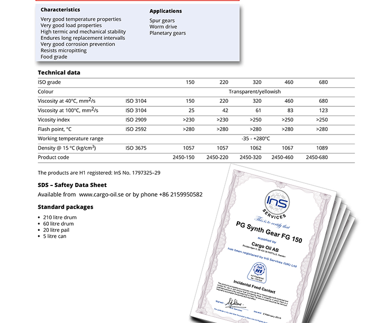PG Synth Gear FG is a polyglycol-based lubricant, primarily intended for use in extreme temperatures and loads. It is based on material certified for incidental food contact and is registered as H1. PG Synth Gear FG is recommended for spur gears and worm drives where longer replacement intervals and lower running temperatures are wanted. In continuous operation PG Synth Gear FG can be used in temperatures between 248 - 392 ºF; 120 - 200 ºC. It can be used for lubricating of sprockets, sliding surfaces and roller bearings and other high temperature applications, especially with ISO 320 – 680